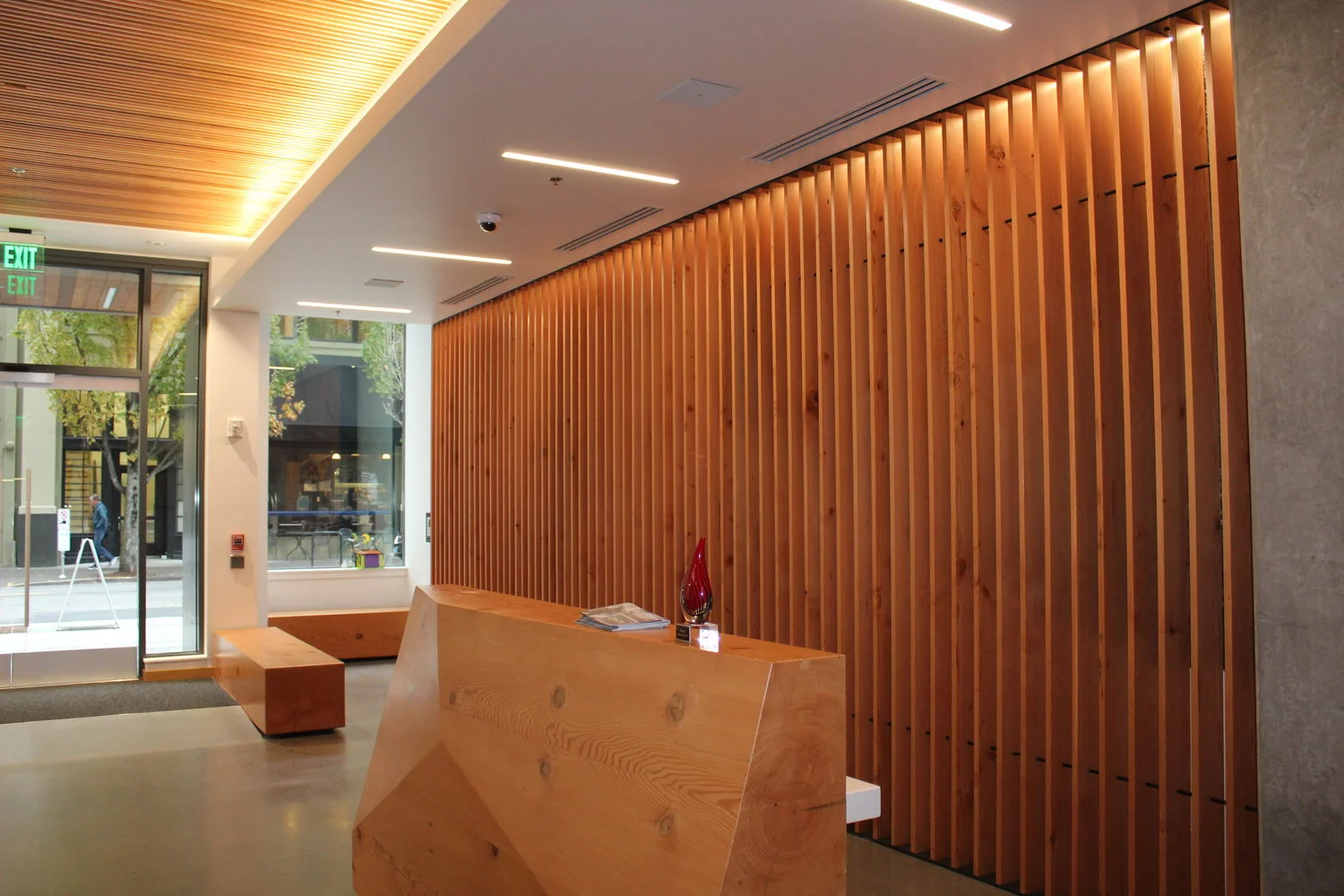 On the ground floor, the leasing office features large fir timber benches complemented by a striking slatted wood ceiling .Ohm Systems installed recessed ceiling speakers from Sonance with square grilles to complement the sleek recessed lighting. Background music content and volume is easily controlled using a wifi-enabled tablet or smart phone.